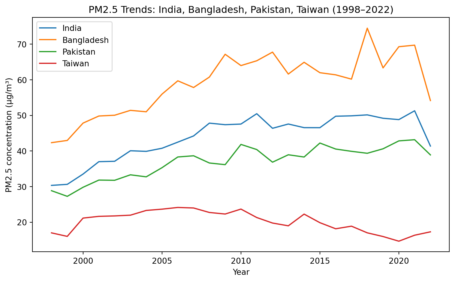 The above charts shows a comparison of air quality trends in South Asia vs Taiwan; while air pollution has increased in India, Bangladesh, and Pakistan, Taiwan has returned to the pollution levels of 1990s.
