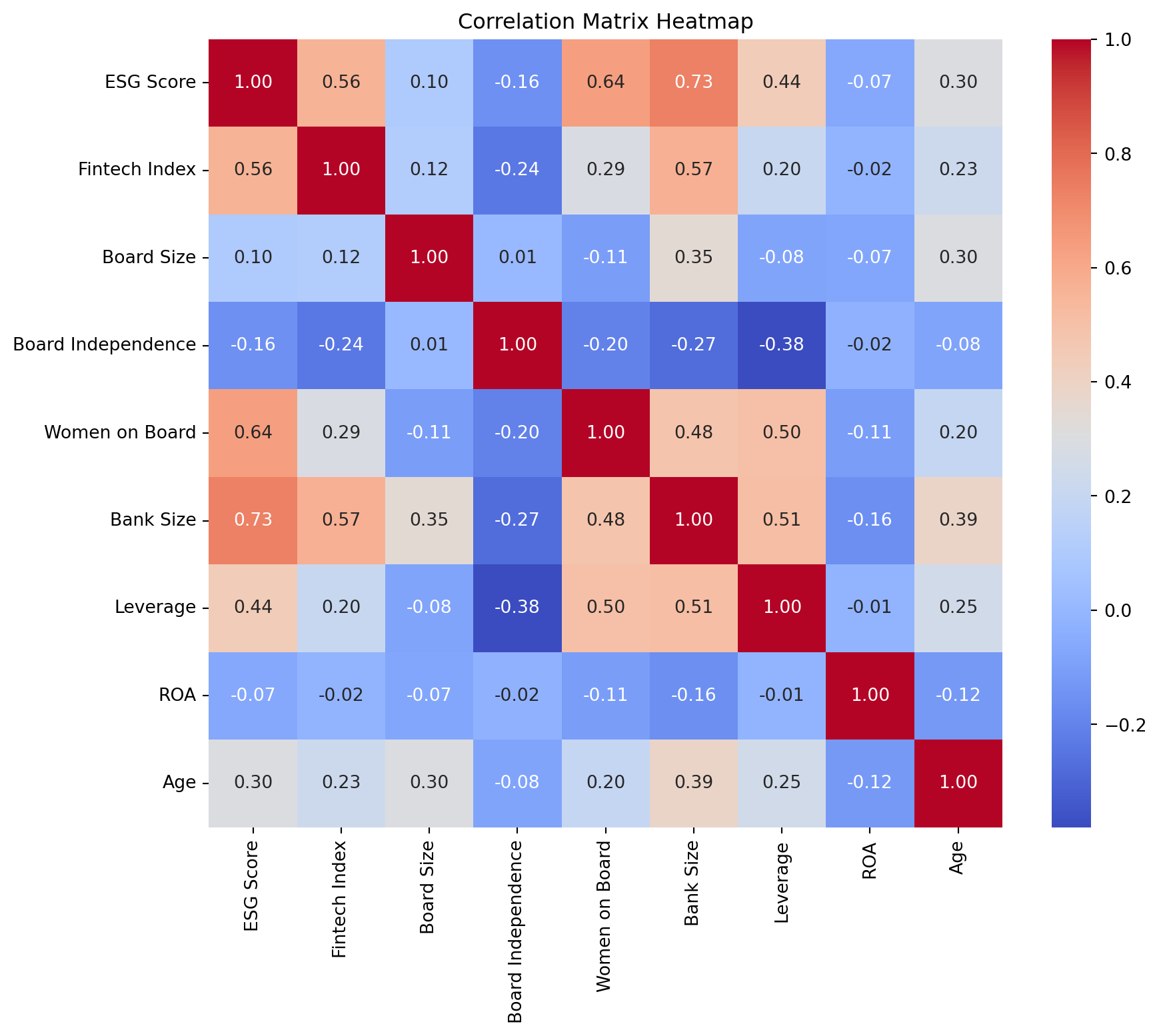 In the U.S. and European banking sector (Dicuonzo et al., 2024) performed an analysis of 1551 banks, of which only 180 banks disclosed sufficient ESG data for comparison, building a Fintech Adoption Index; the key findings included a positive correlation between Fintech Index and ESG Scores, suggesting the adoption of technology has a statistically significant influence on better environmental stewardship, social and governance quality. Even better predictors of a high ESG score were Board Gender Diversity (Women on Board), the Size of the Bank, and Board Independence (governance structures with more independent directors could be more socially and environmentally responsible).