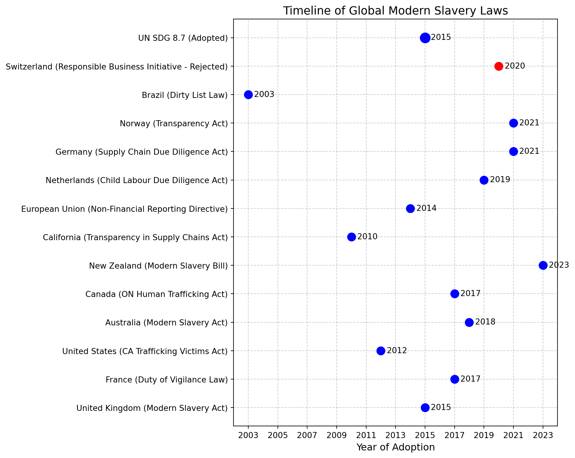 The California Transparency in Supply Chains Act which came into effect in 2012 applies to large retailers and manufacturers focused on pushing companies to to eradicate human trafficking and slavery in their supply chains. Similarly, the German Supply Chain Act (Gesetz über die unternehmerischen Sorgfaltspflichten zur Vermeidung von Menschenrechtsverletzungen in Lieferketten) enacted in 2021 requires companies to monitor violations in their supply chains (Bundesministerium für wirtschaftliche Zusammenarbeit und Entwicklung, 2023; Stretton, 2022).